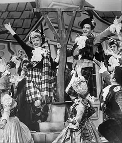 Despite steadily working in pictures, Ball's movie career never advanced to the level of a headlining feature-film actress. Nevertheless, she remained popular with film audiences. Ball came to the attention of Metro-Goldwyn-Mayer after receiving critical acclaim for her starring role in the 1942 Damon Runyon film The Big Street, which bought out her contract.[22] It was under contract with MGM, however, that Ball, who had previously been a blonde, dyed her hair red to complement the Technicolor features that MGM planned to use her in.[23] MGM cast Ball in a variety of films, but it was her work with fellow comedian Red Skelton in the 1943 film DuBarry Was a Lady that brought Ball's physical comedy to the forefront, earning her the reputation as "that crazy redhead”, which Ricky would later call her on the show.[24] Nonetheless, Ball's striking beauty was in sharp contrast to the physical antics she performed in her films. Throughout her career, MGM tried to utilize her in multiple different film genres that did little to highlight her skills. Given their difficulties in casting her, MGM chose not to renew her contract when it expired in 1946.[25]