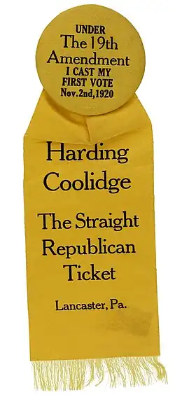 An early predecessor to the "I Voted" sticker is Election Day-related memorabilia in general, such as buttons, pins, and pieces of clothing. The first such item in the collection of the National Museum of American History is an Election Day button from 1920, distributed by the Republican Party in Lancaster, Pennsylvania. The button commemorates the beginning of women's suffrage in the United States, and reads "Under the 19th Amendment I Cast My First Vote, Nov. 2nd, 1920."[4] A 1950 article from the Miami Herald mentions an "I Have Voted" sticker, and voting-themed clothing and paraphernalia flourished following the passage of the 26th Amendment in 1971.[5]