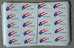 An "I Voted" sticker is given to voters in the United States. Popular nationally since the 1980s, the stickers often feature the text "I Voted" in English or other local languages, with many featuring the United States flag and other patriotic themes.