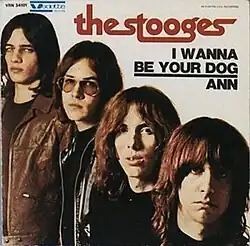 "I Wanna Be Your Dog" is a song by American rock band the Stooges, released as the group's debut single from the band's 1969 self-titled debut album. The riff is composed of only three chords (G, F♯ and E), is played continuously throughout the song (excepting two brief 4-bar bridges). The 3-minute-and-9-second-long song, with its distortion-heavy guitar intro, single-note piano riff played by producer John Cale of the Velvet Underground, and steady, driving beat, gave the cutting edge of the early heavy metal and punk sound.[6]