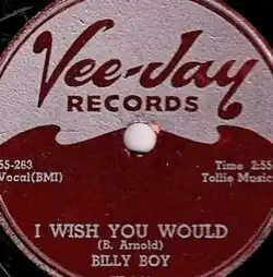The song features a one-chord modal blues structure with a repeating guitar figure and Diddley-style rhythm.[4][5] Backing Arnold (vocal and harmonica) are Jody Williams (guitar), Milton Rector (bass), and Earl Phillips (drums). The single, credited to "Billy Boy", reportedly sold well,[5] but did not appear in the national record charts. Arnold revisited "I Wish You Would" several times during his career, producing new studio versions and live versions of the song for a variety of record labels.[6]