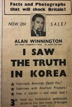 The publishing of this leaflet, along with Winnington's favourable coverage of the North Korean forces during the Korean War, led to Winnington's reputation being attacked by the British government who then made him stateless by refusing to renew his passport.[2]