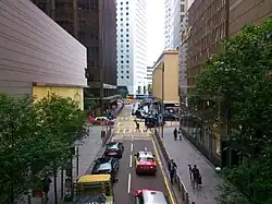 ![]() The northern end of Ice House Street, near the junction with Chater Road. Connaught Road can be seen one block beyond Chater. | |