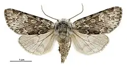 Face grey. Palpi blackish at base. Head and thorax grey, frontal area lighter grey. Head and thorax densely clothed with long dark-grey hair. Thorax broad in proportion to length, with a slight posterior crest. Abdomen grey. Forewings grey, with pale grey lines and occasional darker marks. A single light-grey line at base; a jagged grey line about 1⁄5, strongly dentate near dorsum; outwardly suffused with dark grey. Orbicular faintly shown in light grey, and separated from reniform by a distinct dark-grey patch. Reniform faintly outlined in light grey. A jagged light-grey line at 3⁄4, bending towards termen until centre of wing, then inwards before reaching dorsum. Terminal edge margined with light grey, edged basally with a dark suffusion, which forms a faintly defined line; slight grey marks along veins where they reach termen. Cilia short, light grey and dark grey alternate patches. Hindwings light grey with a faint ochreous tinge, a darker band across wing at J and a slightly waved subterminal band. Terminal edge and cilia grey-white. Underside grey with a faint ochreous tinge and a well-defined irregular dark-grey line at about 3⁄4 across both wings.[2]