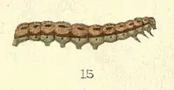 The larva is rather stout, with the anterior segments wrinkled. It varies much in colour; the dorsal surface is usually reddish-brown; the lateral line is broad and black; a series of subdorsal stripes also black; the ventral surface is green. Sometimes these markings are hardly visible, and the larva is entirely green, whilst occasionally the brown colouring predominates.[6]