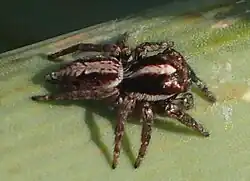 Icius insolidus is a small spider. The spider's body is divided into two main parts: a rather rounded almost rectangular cephalothorax and more pointed and ovoid abdomen.[12] The male has an ovoid and moderately high carapace, the hard upper part of the cephalothorax, that is between 1.8 and 2.4 mm (0.071 and 0.094 in) long and between 1.3 and 1.9 mm (0.051 and 0.075 in) wide. It is very dark brown, nearly black, with a wide streak down the middle formed of white hairs, stripes on the sides and a scattering of grey hairs on its slopes. The eye field has a few brown bristles and short white hairs around the eyes. The spider's sternum, the underside of the carapace, is brown. Its face, the clypeus, is also brown and low with sparse white hairs. Its mouthparts are brown. The chelicerae have a few white hairs visible on the edges; they are large and unidentate with a very large tooth visible on the inner margin of the base. Its maxillae have yellow tips.[13]