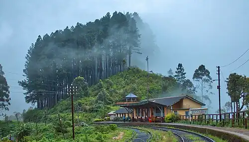 Idalgashinna Railway Station (ඉදල්ගස්හින්න දුම්රිය ස්ථානය), Tamil: இடல்கஷின்னா ரயில் நிலையம்) is the 68th station on the Main Line, and fifth highest railway station in Sri Lanka located between Haputale and Ohiya railway stations in Badulla District, Uva Province. It is located 8 km (5.0 mi) west of Haputale, at an elevation of 1,615 metres (5,299 ft) above sea level. The station was built after the track was extended in 1893, from the Nanu Oya railway station to Haputale. This is the 68th railway station on the Colombo-Badulla railway line. The railway station is located on a hilltop separating the southern and eastern parts of Sri Lanka. Because of this the environment is constantly foggy and instantly clear. Depending on the location, rainwater from the Idalgashinna railway station collects in front of the roof to the Mahaweli river valley and water falling from the back of the roof to the Walawe river valley.