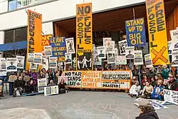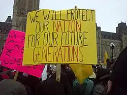 The Idle No More movement generally opposes certain types of resource exploitation, particularly on First Nations territory.[24] The movement takes this stance against resource exploitation, as attributed to First Nations sovereignty and environmental sustainability.[25] The position is supported by many groups including non-governmental and grassroots organizations. In a human rights report on Canada, Amnesty International suggested that the government should have "respect for indigenous rights when issuing licences for mining, logging and petroleum and other resource extraction."[26]