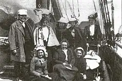 Biggam and the steward went back up on deck. Biggam said that Ida May followed them on deck at first, but then returned to the cabin, calling for her mother.[85] Biggam saw Capt. Holmes and Olaf Neilson[ar] holding on to Jane Corrigan near the port railing, to keep her out of the water.[40] She was begging the crew to save her mother.[37] Biggam[40] and Holmes tried to get Mary and Jane to climb the crosstrees,[31] so that when the yacht righted they would be clear of the water, but waves swept all six overboard.[37][68]