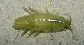 The color of the body is extremely variable, ranging from muted greens to striking black-and-silver patternings; the female is usually darker.[3] On the other hand, the males are frequently colored a light green.[6] Color intensity is variable and can be altered through the restriction and dilation of chromatophores.[6] Additionally, males and females display different coloration (sexual dimorphism) due to selection for different behaviors in the two sexes.[6] Researchers also believe that the primary cause of selection for this color polymorphism within localized populations is predation (from carnivorous fish, crabs) in conjunction with gene flow and varying microhabitats.[7][8] The color polymorphism allows for the isopod to display cryptic coloration in multiple microhabitats.[6][7]
