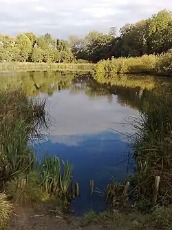 Ifield Mill Pond lies between Bewbush, Gossops Green and Ifield West. It is the source of the River Mole which runs north to the River Thames above Teddington Lock. In 1683[7] Ifield Water Mill, a corn mill, was built in the north of the pond; it used water from the mill pond to turn its water wheel. It was rebuilt in 1817 and is now being restored.[8] The restoration has been led by a team of volunteers and spearheaded by Ted Henbery MBE, who has spent 34 years on the project after his son discovered the disused site in 1974.[9] A second project to upgrade the Mill Pond concluded in July 2015 after £6.5 million was spent upgrading the dam, finished £1 million under budget.[10] The Mill Pond is considered to be "the most important wetland site in Crawley"[11] and supports a rich bird community.