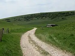 A path climbs up Whiteway Bottom to Pickers Hill and on the top there was a barrow field. It is ploughed out now. When the sun is low you can see bold prehistoric field lynchets at the head of the Whiteway combe (TQ 391 052), and back towards Highdole in the Rodmell parish, as well as up the dean around Long Bottom. The south slope of Whiteway Bottom (TQ 396 054) is a tranquil old Down pasture site. It was damaged by agro-chemicals at its western end, but the middle and eastern end are intact, with lots of butterflies, including small heath, chalkhill blue, common blue and marbled white, and lots of old Down pasture herbs.[9]