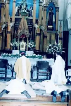 When the necessary canonical authorizations were granted, the priests of the Society of Jesus received the church and residence of El Carmen in January 1916. The sanctuary had to be repaired a little over a year later due to an earthquake. The painting and artistic restoration was performed by brother Frías S.J. He is the same artist who painted the image of the Lady of Guadalupe in the Gothic altar of the Salesian workshops of the School of Arts and Trades in Santa Tecla. The crucified Christ of the altar and the screen of the main gate as well as the confessional booths and pulpit were carved in these workshops.
