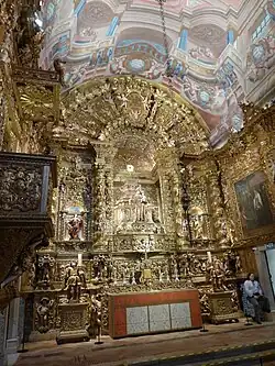 Igreja de Santo António is a church in Lagos,Portugal. It is classified as a National Monument. It is one of the main monuments in the city, being known for its interior richness in gilded carving. Attached to the church building is the Municipal Museum of Lagos. The church was commissioned by the military, and was completed in 1707. It was destroyed by the earthquake of 1755, and rebuilt in 1769 by order of the commander of the Lagos Infantry Regiment, Hugo Beaty, who was also administrator of the Confraternity of Saint Anthony. It was also on that date that the eight paintings with the miracles of Saint Anthony were produced. Inside the church, the tiles, the paintings of the vault and the gilded carving were also installed during the eighteenth century. According to popular tradition, the church had a rich collection of silver and sacred art, which were looted during the French occupation in the early nineteenth century. In 1823 the clock tower was built, whose stonework was used from the ruins of the Church of Santa Maria.In 1932 the municipal museum was installed in the old South Sacristy. It was elevated to a National Monument in 1924.