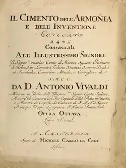 Il cimento dell’armonia e dell’inventione (The Contest Between Harmony and Invention) is a set of twelve concertos written by Antonio Vivaldi and published in 1725 as Op. 8. All are for violin solo, strings and basso continuo. The first four, which date back to 1718–23, are called The Four Seasons (Le quattro stagioni). The set was published in the Amsterdam workshop of Michel-Charles Le Cène and dedicated to Wenceslas, Count of Morzin,[1] an advisor to Charles VI, Holy Roman Emperor (not to be confused with Karl Joseph, Count Morzin, benefactor of Joseph Haydn).