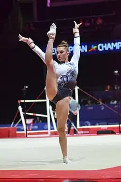 In February, she competed at the Austrian Open, helping her team to the silver medal and placing fifth individually.[18] At the World Challenge Cup in Doha in March, she placed seventh on bars and won the bronze medal in the floor final with a score of 13.750.[19]