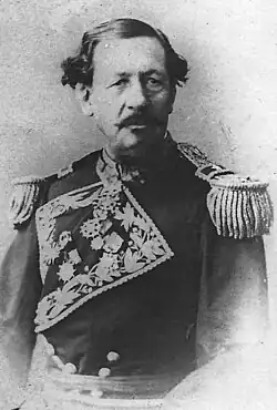 He was an important supporter of José Ballivián until his overthrow in 1847 by Belzu. After Belzu's coup, Sanjinés was appointed commander of the garrison of Cochabamba. However, he remained informed about the politics of his time, like all military officers of that time, and was to leave his retirement to join the revolution against José Miguel de Velasco. Sanjinés took part in many revolutions and mutinies, including in 1854 against Belzu.[6] For this his insurrection, he was erased from the military officer's list of the Bolivian Army and declared a national traitor.[7] During the presidency of José María de Achá, Sanjinés had attempted to rebel in support of Belzu, however, fearing a takeover by Mariano Melgarejo, he allied himself to Achá and was made a member of the powerful Council of State on October 28, 1864.[8]