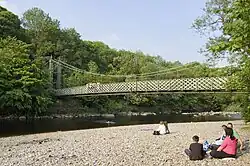 The town partially straddles the River Wharfe in a valley, rising from the river at 230 feet (70 m) to 650 feet (200 m) above sea level, up Ilkley Moor (a bracken and heather covered moorland, with rocky outcrops, to the south) and to 540 feet (160 m) across Middleton Woods in the north. The river runs through the northern extent of the town from west to east, and is crossed by four bridges, in order: a 16th century three-arched stone bridge, now closed to road traffic; a 19th century single-span wrought-iron bridge; a suspension bridge for foot traffic only (a set of concrete stepping stones) and a prefabricated steel arched box-girder bridge. The river is prone to flooding the sports fields (and a few houses) that occupy the watermeadows.[31] Below the historic Ilkley golf club house, in Middleton, the access to Nesfield is regularly restricted due to the river closing the road.