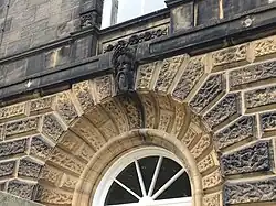 The masonry of the facade is richly textured and detailed; the ground storey and tower corners are faced with the "astrakhan"-type vermiculation used on parts of the Louvre,[1] and smooth-faced ashlar walls to the upper storeys. An arched central doorway has a deeply recessed surround and carved keystone head.
