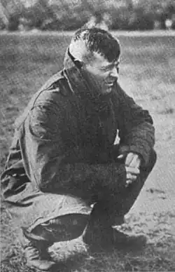 In 1927, the Fighting Illini compiled a 7–0–1 record (5–0 against Western Conference opponents) and outscored their opponents by a combined total of 152–24.[25] The team was selected as the 1927 national champion by the Billingsley Report, Dickinson System, Helms Athletic Foundation, National Championship Foundation, and Parke H. Davis.[26] Though the team had no consensus All-Americans and was known for its lack of prominent names, center Robert Reitsch and guard Russ Crane made a handful of first-team selections. Reitsch was also the team captain.[22] Illinois struggled from 1930 to 1941, posting seven losing seasons and no conference championships.[27] The Illini did finish 7–1 in 1934, however, this proved to be the last season of six or more wins during the Zuppke era.[28] Zuppke retired from Illinois following a 2–6 campaign in 1941,[29] leaving the Illini after compiling a 131–81–12 record.[30]