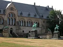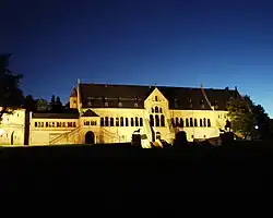 The Imperial Palace of Goslar (German: Kaiserpfalz Goslar) is a historical building complex at the foot of the Rammelsberg hill in the south of the town of Goslar north of the Harz mountains, central Germany. It covers an area of about 340 by 180 metres. The palace grounds originally included the Kaiserhaus, the old collegiate church of St. Simon and St. Jude, the palace chapel of St. Ulrich and the Church of Our Lady (Liebfrauenkirche). The Kaiserhaus, which has been extensively restored in the late 19th century,[1] was a favourite imperial residence, especially for the Salian emperors. As early as the 11th century, the buildings of the imperial palace had already so impressed the chronicler Lambert of Hersfeld that he described it as the "most famous residence in the empire". Since 1992, the palace site, together with the Goslar's Old Town and the Rammelsberg has been a UNESCO World Heritage Site because of its millennium-long association with mining and testimony to the exchange and advancement of mining technology throughout history.[2]