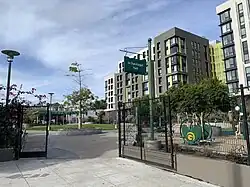 Facilities include a playground, a gym for adults, a drought-resistant community garden, greenhouses, and a small stage for public performances on the central plaza.[4][5] An interactive water installation commemorates Mission Creek, which used to run through the site.[6] Artist Carmen Lomas Garza created renderings of a California condor and a great blue heron adorning the fence, commissioned by the San Francisco Arts Commission.[3]