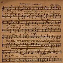 "In the Gloaming" is an 1877 British song composed by Annie Fortescue Harrison with lyrics taken from a poem by Meta Orred. Orred's poem (of the same title as the song) appeared in her 1874 book Poems.[1] "Gloaming" is a regional dialect term of Scots origin denoting "twilight".[2]