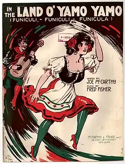In the Land O' Yamo Yamo is a World War I song written in 1917.[1] Joe McCarthy wrote the lyrics and Fred Fisher composed the music. McCarthy & Fisher, Inc. produced the song in New York, New York. On the cover of the sheet music is a man playing the guitar as a woman dances in the foreground.[2] The lyrics describe a place that is not found on the map, but resembles "Old Napoli," referring to a city in Italy. "Yamo Yamo" is an English transliteration of the Neapolitan phrase "iammo, iammo", a dialectal reduction of "andiamo, andiamo" ("let's go, let's go") and the beginning of the chorus of the worldwide popular Italian song "Funiculì, Funiculà", which is mentioned in "Yamo Yamo"'s subtitle. "Yamo Yamo" is illustrated in the chorus as a place where the "good fellows are" and where "you can never hear them talk about the war."[1] The song reached number two on the US song charts in May 1918.[3]