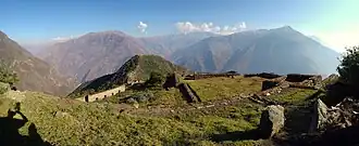 ![]() The mountains Incahuasi (on the left) and K'usilluyuq (on the right) as seen from Choquequirao | |