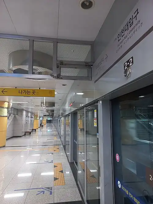 Incheon National University Station is a subway station on Line 1 of the Incheon Subway in Yeonsu District, Incheon, South Korea. It has four exits connecting it to Incheon National University, nearby hotels, and the east side of Songdo Central Park.