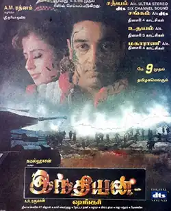Indian is a 1996 Indian Tamil-language vigilante action film directed by S. Shankar, who wrote the script with dialogues by Sujatha, and produced by A. M. Rathnam. The film stars Kamal Haasan in dual roles, alongside Manisha Koirala, Urmila Matondkar, Sukanya, Manorama, Goundamani, Senthil, Nedumudi Venu, Kasthuri, Nizhalgal Ravi and Ajay Rathnam. It is the first instalment in the Indian film series. The music was composed by A. R. Rahman, while cinematography and editing were handled by Jeeva and B. Lenin-V. T. Vijayan. In the film, Senapathy, a retired freedom fighter rebels against corruption in India, which puts him in conflict with his son Chandru, who lives by corruption.