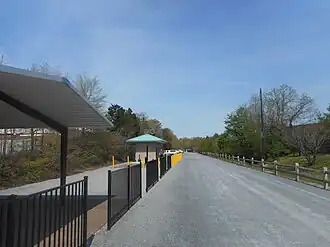 The trail project was briefly held up when, in 2007, Alcoa considered building a 950-megawatt coal-fired plant on the Navy base and using the rail line to deliver coal to it. In September 2007 Alcoa decided that if they built the plant they would not need the rails.[12][13] In 2008, Charles County's Department of Public Facilities removed the rails and ties and sold them, it used the revenue from the sale to help pay for the trail that it built.[14] They completed a two-mile long segment in White Plains and a 2.7-mile segment in Indian Head in December of 2008.[15][16][4] The second section of the trail, paid for with $250,000 of Charles County money, opened in June 2009 and the trail was completed later that year.[17][18] A bathroom facility and two water fountains were completed in 2010.[19]