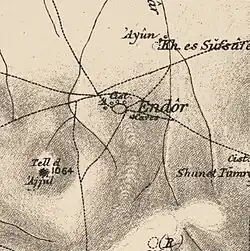 The name of this village is thought to preserve that of the ancient Canaanite city of Endor mentioned in the Bible as the place King Saul encountered a known medium. While a few scholars believe that Indur is the actual site of ancient Endor, no ancient remains have been found at the site, and many believe that Khirbet Safsafa, located 1 kilometre (0.62 mi) to the northeast, is a more likely candidate.[4][5][6]