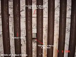 The radiant section is where the tubes receive almost all its heat by radiation from the flame. In a vertical, cylindrical furnace, the tubes are vertical. Tubes can be vertical or horizontal, placed along the refractory wall, in the middle, etc., or arranged in cells. Studs are used to hold the insulation together and on the wall of the furnace. They are placed about 1 ft (300 mm) apart in this picture of the inside of a furnace.