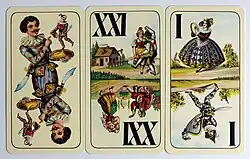 Industrie und Glück (Early Modern German for "Diligence and Fortune"[a]) is a pattern of French suited playing cards used to play tarock. The name originates from an inscription found on the second trump card. This deck was developed during the nineteenth century in the Austro-Hungarian Empire.[1] The earliest known examples were made in Vienna in 1815. After the collapse of the empire in World War I, it remained the most widely used tarot deck pattern in Central Europe and is used by almost all tarock players throughout the former parts of the empire.[2]