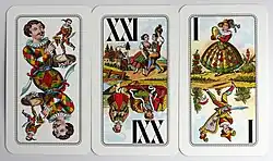 A 78-card version by Piatnik was once made to play Grosstarock (No. 1938); it was also adapted for the Austrian game of Droggn, although players used only 66 cards from the pack.[7] There was also a mysterious 73-card version from the 1930s, also by Piatnik, which was composed like the 54-card deck but with 19 more trumps.[8][9][10][11] It is believed to have been used for a lost version of Minchiate.