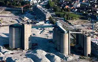 Cement factories, part of the manufacturing industry, produce product for the construction industry (also known as the building industry). This factory was in Malmö, Sweden.