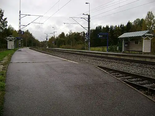 Ingå railway station (Swedish: Ingå järnvägsstation, Finnish: Inkoon rautatieasema) is a railway station in the municipality of Ingå, Finland, between the stations of Siuntio and Karis. It is located 19.3 kilometres (12.0 mi) west of the Siuntio station and 16 kilometres (9.9 mi) east of the Karis station. The station was designed by architect Bruno Granholm.