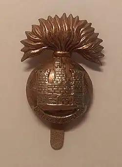 On 1 July 1881 the 27th (Inniskilling) Regiment of Foot and the 108th Regiment of Foot were redesignated as the 1st and 2nd Battalions, The Royal Inniskilling Fusiliers, respectively.[1][2] In 1903 the Regiment was granted a grey hackle for their fusilier raccoon-skin hats to commemorate the original grey uniforms of the Inniskilling Regiment.[3][4]