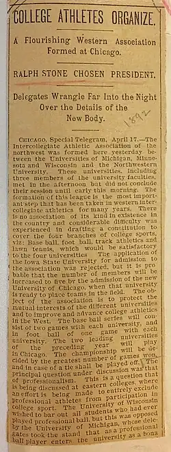 - ^ "College Athletes Organize". unknown. April 17, 1892.(newspaper clipping located in the Ralph Stone papers, Bentley Historical Library, Box 1, folder "Intercollegiate Athletic Association of the Northwest 1950-1951")