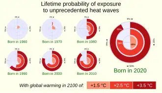 Successive generations are predicted to experience progressively greater unprecedented lifetime exposure (ULE) events such as heat waves.[39] About 111 million children born in 2020 will live with unprecedented heatwave exposure in a world that warms by 3.5 °C, compared with 62 million with only 1.5 °C of warming.[39]