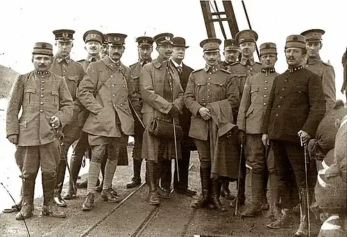 De Veer and Thomson prepared a classified 150-page report on the setting up of the gendarmerie. There were discussions of 5,000 gendarmes led by Dutch officers provided by the government of the Netherlands.[8] On 24 February 1914, 13 Dutch officers arrived at Vlorë: Captain Fabius, Major Kroon, Major De Waal, Major Sluys, Captain Doorman, Major Roelfsema, Dr. De Groot, Captain Sar, Major Verhulst, Major Snellen van Vollenhoven, First Lieutenant Mallinckrodt, Captains Reimers and Sonne.