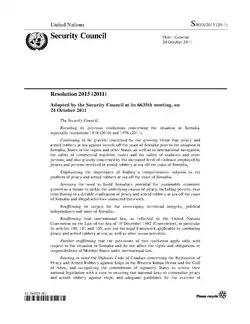 The collapse of the Somali State in the 1990s opened the region to illegal, unreported and unregulated fishing (IUU), as well as the unregulated disposal of toxic waste by rich States.[26] Somalia Pirates claim that they take to the seas in order to protect pillaged local resources, and in response to lost income.[10] A series of UNSC Resolutions concerned piracy in Somalia. The United Nations Security Council Resolution 1918 adopted in 2010, called on States to establish national piracy laws and to prosecute Somalia pirates.[27]
