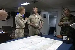 A Dutch navy officer and a U.S. Navy officer coordinating relief efforts.