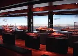 The walkabout starts with a 3,000-year-old dugout, which was found in the Elbe river.[13] Another exhibit is the baton of Großadmiral Karl Dönitz (1891–1945), displayed in an article about the Nuremberg Trials in the newspaper Berliner Zeitung of 1946. This article describes the sentences against the Nazi war criminals. The exhibition of the baton was often taken as an example of the lack of historical awareness about Nazi propaganda and the lack of distance toward Nazi symbolism, without challenging it.[3][4] Further the exhibition consists of paintings with a naval or marine theme, model ships made of whale bones or ivory, weapons, uniforms, and decorations.[13] Also the reproduction of the James Caird, the small lifeboat of Sir Ernest Shackleton's Imperial Trans-Antarctic Expedition, used by the German explorer Arved Fuchs in a relived journey in 2000,[15] is displayed.[16] The museum's archive also possesses 47 original letters of Lord Horatio Nelson, famous for his victory at the Battle of Trafalgar, and 15,000 cruise ship menus.[13]