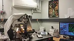 In mammals, in some experimental settings a surgical implantation of an imaging window is performed prior to intravital microscopy. This allows repeated observations over several days or weeks. For example, if researchers want to visualize liver cells of a live mouse they will implant an imaging window into mouse's abdomen.[2] Mice are the most common choice of animals for intravital microscopy but in special cases other rodents such as rats might be more suitable. Animals are usually anesthetized throughout surgeries and imaging sessions. Intravital microscopy is used in several areas of research including neurology, immunology, stem cell studies and others. This technique is particularly useful to assess a progression of a disease or an effect of a drug.[1]