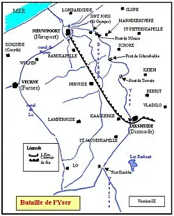 The Battle of the Yser took place in October 1914 along a 35 km (22 mi) long stretch of the Yser river and Yperlee canal in Belgium.[44] On 15 October c. 50,000 Belgian troops ended their retreat from Antwerp and took post between Nieuwpoort and French Fusiliers Marins at Diksmuide, which marked the end of the "Race to the Sea". Both sides conducted offensives and when the attacks by the Tenth Army and the BEF to Lille was defeated in early October, more French troops were sent to the north and formed the Détachement d'Armée de Belgique ("Army Detachment of Belgium") under the command of General Victor d'Urbal.[45] Falkenhayn assembled a new 4th Army from the III Reserve Corps, available since the fall of Antwerp and four new reserve corps, which had been raised in Germany in August and were deficient in training, weapons, equipment and leadership. The 4th Army offensive along the coast to St. Omer, began with operations against the Belgians, to drive them back from the Yser.[46]