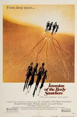 Invasion of the Body Snatchers is a 1978 American science fiction psychological horror film directed by Philip Kaufman, written by W. D. Richter, and starring Donald Sutherland, Brooke Adams, Veronica Cartwright, Jeff Goldblum, and Leonard Nimoy. It is based on the 1955 novel The Body Snatchers by Jack Finney. The novel was previously adapted into the 1956 film of the same name. The plot involves a San Francisco health inspector and his colleague who over the course of a few days discover that humans are being replaced by alien duplicates; each is a perfect biological clone of the person replaced, but devoid of empathy and humanity.