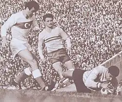 He spent eight seasons at Rapid, making a successful partnership in the team's offence with Emil Dumitriu, winning the Divizia A top-scorer title twice, in the 1962–63 season with 20 goals and in 1965–66 with 24 goals.[4][5][6] In the 1966–67 season, under the guidance of coach Valentin Stănescu he helped Rapid win the first league title in the club's history, being the team's top-scorer with 15 goals scored in 22 matches.[4][5][8][9] In the following season he appeared in four matches in the 1967–68 European Cup campaign, scoring one goal against Trakia Plovdiv that helped Rapid advance to the following round where they were eliminated by Juventus.[4][10] Ionescu reached three Cupa României finals, playing in the last two.[11][12][13] The first two in 1961 and 1962 under the guidance of coach Ion Mihăilescu were lost to Arieșul Turda and Steaua București respectively, while during the one in 1968 he was coached by Stănescu in the loss against Dinamo București.[11][12][13] For the way he played in 1967, Ionescu was placed fourth in the ranking for the Romanian Footballer of the Year award.[14]