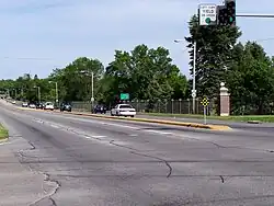 Iowa Highway 163 begins at the corner of E. 14th Street, which carries U.S. Highway 69 (US 69), and E. University Avenue in Des Moines. It heads east along E. University traveling 34 mile (1.2 km) to Interstate 235 (I-235).[1] There is no direct access to eastbound I-235 from eastbound Iowa 163. Traffic must take E. 21st Street to Easton Boulevard to access eastbound I-235. Highway 163 continues east past the Iowa State Fairgrounds on its way to Pleasant Hill where it meets U.S. Highway 65 at a diamond interchange.